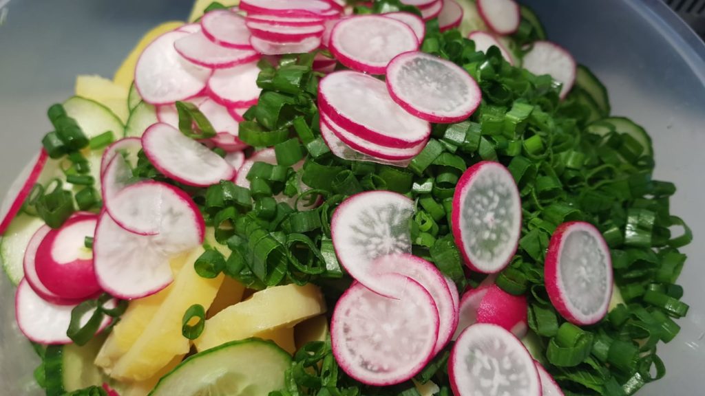 - Von den FRühlingszwiebel das Grün in feine Ringe schneiden und ebenso zum Salat geben.