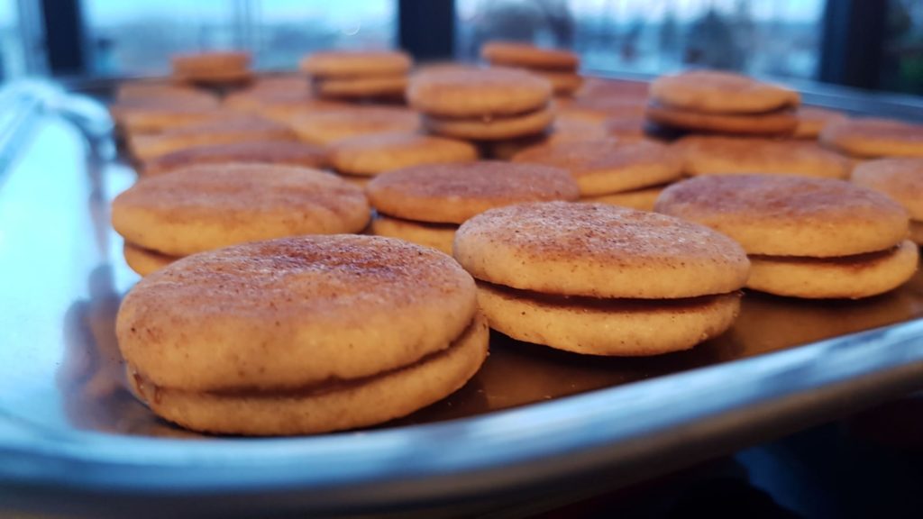 - Inzwischen Nougat im Wasserbad vorsichtig unter Rühren erwärmen, aber nicht kochen. Nougat auf der Hälfte der Zimtplätzchen verteilen und mit einem zweiten Zimtplätzchen belegen.
